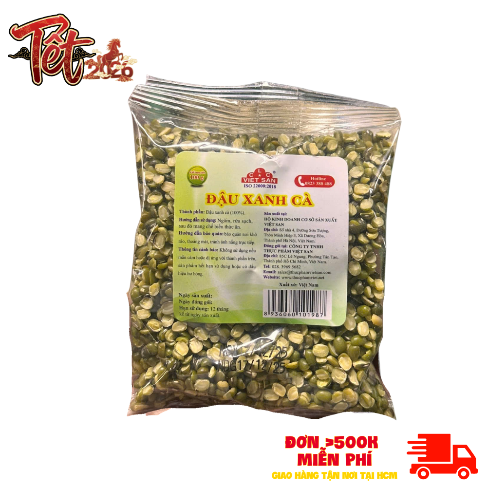 Đậu xanh cà 100g là loại hạt quen thuộc trong đời sống hằng ngày, giàu dinh dưỡng và dễ chế biến. Hạt đậu xanh Việt San được chọn lọc kỹ, cà vỡ đôi, giữ nguyên hương vị tự nhiên, thích hợp dùng trong nhiều món ăn truyền thống.